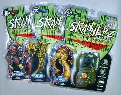 Skannerz is a stand alone portable game franchise that started in the year 2000. The devices are barcode battlers in which you scan various barcodes and collect monsters, items, and get into battles with other tribes. These devices also could be link allowing players to battle against other Skannerz. Originally there were three tribe Skannerz, later a new one was released called Skannerz Commander. This Skanner could battle other Skannerz Comanders however was incompatible with the original tribe Skannerz. Later Skannerz Racerz was made which was a barcode scanning game in which the player could collect cars, and parts to make better vehiciles for racing. The last Skannerz product released was the Skannerz Battle Orbz, a monster fighting game. Orbz does not involve barcodes in any way.